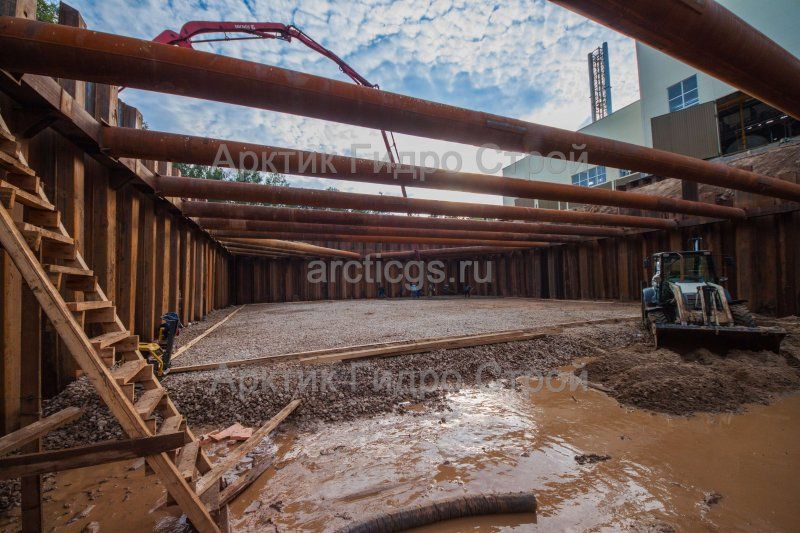 Шпунтовое ограждение котлована из шпунта Ларсена с распорами, выполненное специалистами «АрктикГидроСтрой»